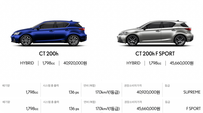 ๋ ์์ค CT ์ฐจ์ข ์ CT200h, CT200h F Sport 2๊ฐ์ง ์ข ๋ฅ๋ก ์ถ์๋์์ผ๋ฉฐ, ๊ฐ๊ฒฉ์ 40,920,000์, 45,660,000์์ด๋ฉฐ, 2๊ฐ์ง ๋ชจ๋ ํ์ด๋ธ๋ฆฌ๋ ์ฐจ๋์ด๋ฉฐ, ๋ฐฐ๊ธฐ๋์ 1,798cc๋ก ์ถ์๊ฐ ๋์์ต๋๋ค.
