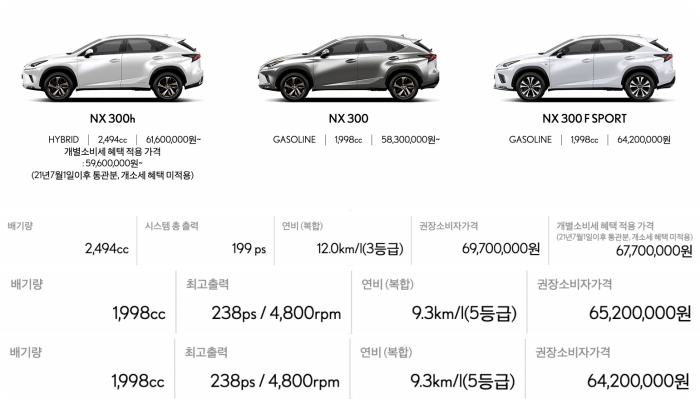 NX300h, NX300, NX300 F Sport์ ๊ฐ๊ฒฉ์ ๊ฐ๊ฐ 61,600,000์, 58,300,000์, 64,200,000์์ผ๋ก nx300h๊ฐ ํ์ด๋ธ๋ฆฌ๋๋ก, NX 300์ ๊ฐ์๋ฆฐ์ผ๋ก, NX 300 F Sportsms ๊ฐ์๋ฆฐ ์ฐจ๋ ์ข ๋ฅ๋ก ์ถ์๊ฐ ๋์๊ณ ๋ฐฐ๊ธฐ๋์ ํ์ด๋ธ๋ฆฌ๋ํ NX300h๋ง 2,494cc์ด๊ณ ๋๋จธ์ง 2๊ฐ์ง NX์ฐจ๋์ 1,998cc ์ฐจ๋์ ๋๋ค.