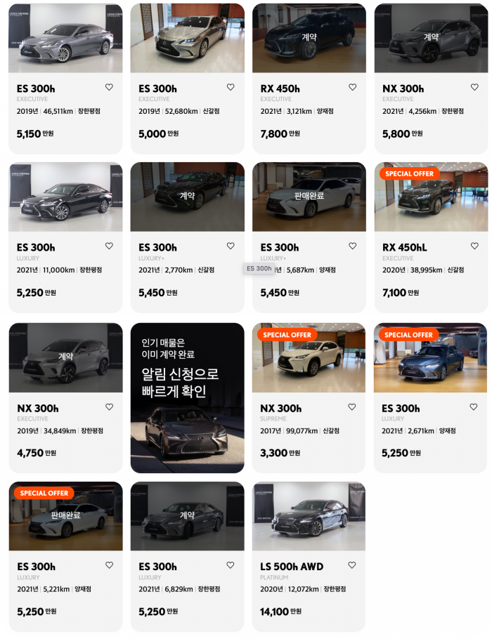 ๋ํ ๋ ์์ค๋ ๊ณต์ ์ธ์ฆ ์ค๊ณ ์ฐจ ์ฌ์ดํธ์ ๋ฒ์ธ ์ ์ฉ ํ๋ก๊ทธ๋จ์ ์ด์ ์ค์ ์์ต๋๋ค. ๊ทธ๋ผ ๋ ์์ค ํ์ด๋ธ๋ฆฌ๋ ๊ธฐ์ข ๋ณ ๊ฐ๊ฒฉ๋๋ฅผ ๋จผ์ ์์๋ณด๋๋ก ํ๊ฒ ์ต๋๋ค. ๋ ์์ค ์ ํ์ es300H๋ก 9์ ๋ง๊น์ง ์ฌ์ ์์ฝ ์ค์ด๊ณ ํ์ด๋ธ๋ฆฌ๋๋ก ์ถ์๊ฐ ๋์์ต๋๋ค.