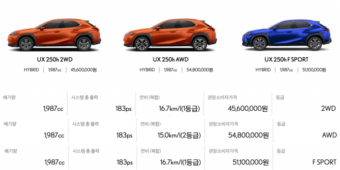 ๋ ์์ค UX ์นดํ ๊ณ ๋ฆฌ ์ฐจ๋ ๋ชจ๋ธ์ ์ต์ 45,600,000์์ผ๋ก ์์์ ํ๋ฉฐ, UX250h 2wd, UX250h awd, UX250h F Sport 3๊ฐ์ง ์ข ๋ฅ๋ก ์ถ์๋์ด ์์ต๋๋ค. ๋ฐฐ๊ธฐ๋์ ํ์ด๋ธ๋ฆฌ๋ํ UX250h 2wd, UX250h awd, UX250h F Sport ๋ชจ๋ 1,987cc ์ฐจ๋์ ๋๋ค.