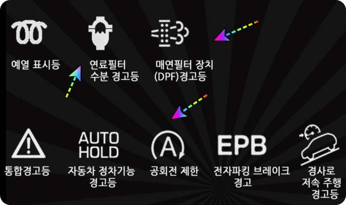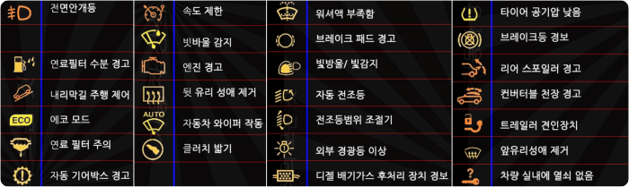 ์ ๋ฉด ์๊ฐ๋ฑ, ์ฐ๋ฃํํฐ ์๋ถ ๊ฒฝ๊ณ , ๋ด๋ฆฌ๋ง๊ธธ ์ฃผํ ์ ์ด, ์์ฝ ๋ชจ๋, ์ฐ๋ฃํํฐ ์ฃผ์, ์๋์ ํ, ์์ง๊ฒฝ๊ณ ๋ฑ, ์์ ์ก ๋ถ์กฑํจ, ๋ธ๋ ์ดํฌ ํจ๋ ๊ฒฝ๊ณ , ์๋ ์ ์กฐ๋ฑ, ํ์ด์ด ๊ณต๊ธฐ์ ๋ฎ์, ๋ธ๋ ์ดํฌ๋ฑ ๊ฒฝ๋ณด๋ฑ ์์ผ๋ฉด ๊ฒฝ๋ ๋ฑ์ ์ฐจ๋์ ์ข ๋ฅ์ ์ฐ์์ ๋ฐ๋ผ ์๊ณ ์์ผ๋ ์ฐธ๊ณ ํ์๊ธฐ ๋ฐ๋๋๋ค.