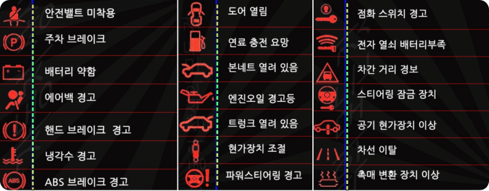 ์ž๋™์ฐจ ๊ฒฝ๊ณ ๋“ฑ ์ข…๋ฅ˜ ๋ฐ ์กฐ์น˜ ๋ฐฉ๋ฒ• (์—”์ง„๊ฒฝ๊ณ ๋“ฑ ๋ƒ‰๊ฐ์ˆ˜ ๊ฒฝ๊ณ ๋“ฑ ๊ณ„๊ธฐํŒ๊ฒฝ๊ณ ๋“ฑ ์ฃผํ™ฉ์ƒ‰๊ฒฝ๊ณ ๋“ฑ)